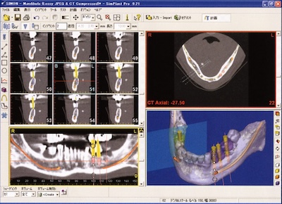 インプラント治療を希望する場合には顎のCTを撮影し、そのデータを元にして「SimPlant」と呼ばれるコンピュータシステムでシミュレーションを行います。このシステムを活用すると、あらかじめ「どの位置に、どの大きさのインプラントを埋入するか」といったシミュレーションを行えます。